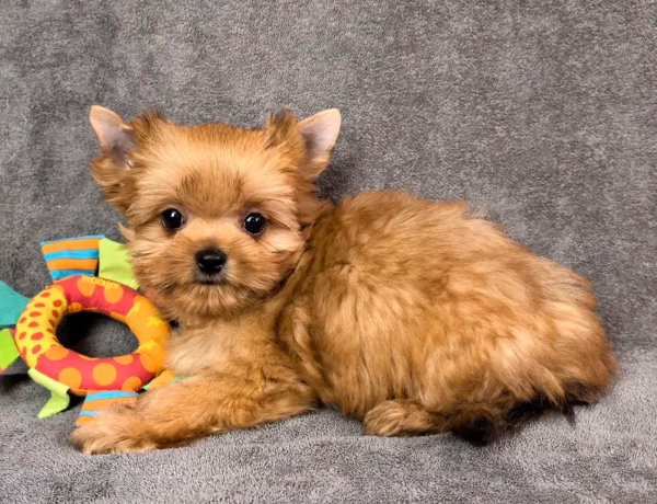 Очаровательный и яркий мальчик Русской салонной собаки миниатюрного размера, ожидаемый вес до 2,5 кг. Малыш похож на плюшевую игрушку. У него очаровательная кукольная мордочка, милый курносый носик и глазки - бусинки. Шерсть мальчика шелковая на ощупь, идеального качества с ярким солнечным окрасом.