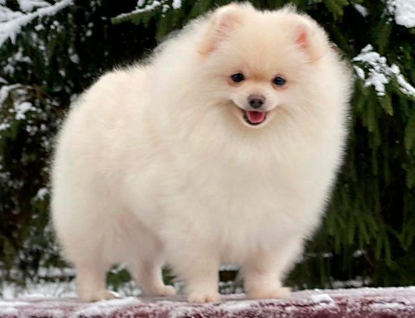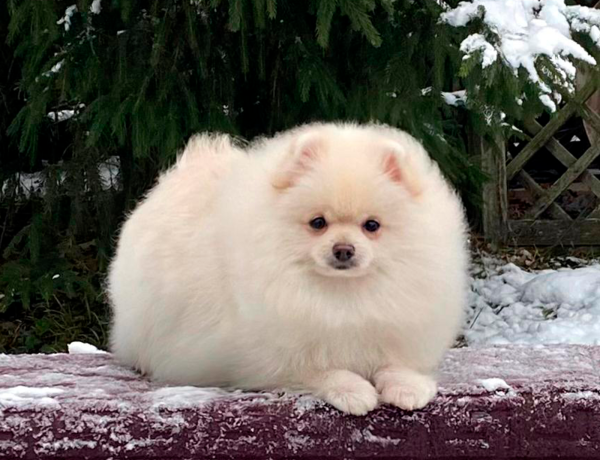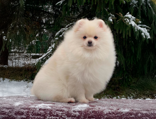 Пушистый, белоснежный мальчик представляет породу Померанский шпиц. Стандартного размера, 100% померанец. Взрослый вес до 3,5 кг., рост 23 см. У него крепкий корпус, великолепная анатомия, восхитительная породная голова и милое выражение. Белоснежный окрас безупречного качества, сейчас активно набирает шубку после детской линьки.