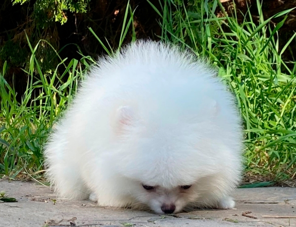 Девочка миниатюрная, великолепно сложена, ожидаемый вес до 2 кг., рост 21 см., с красивой породной головой. Её богатая шубка идеального качества, очень пушистая, белоснежного окраса, отличный пигмент.