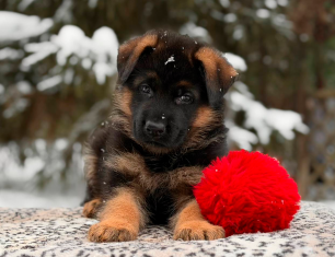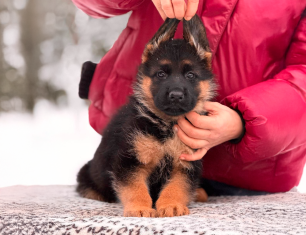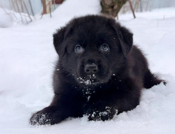 Самый крупный мальчик в помете. Великолепно сложен, крепкий, с правильными породными формами, красивой головой, очень выразительной мордочкой. Малыш имеет породную стандартную шерсть и яркий черный окрас. Обещает вырасти настоящим красавчиком.