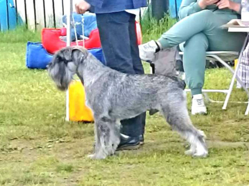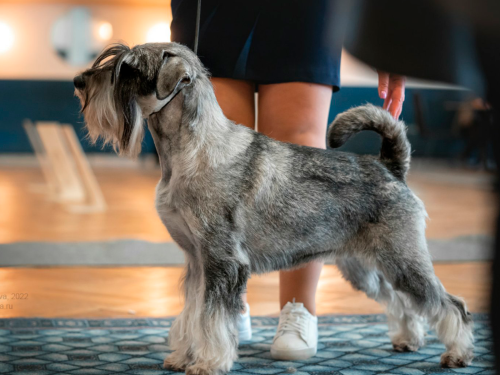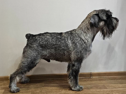 Щенок имеет правильное породное сложение, компактная, во взрослом возрасте, соответственно стандартам породы, ожидаемый рост 45— 50 см., вес 14—20 кг. У малышки крепкий костяк, красивая голова, очень выразительная мордочка. Шерсть девочки правильной структуры и красивый породный окрас перец с солью.