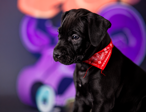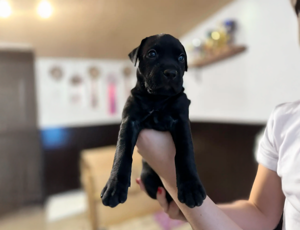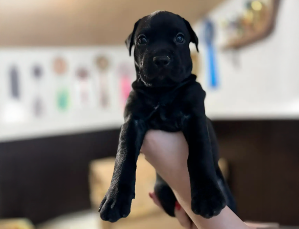 Малыш отлично сложен, с крепким спортивным сложением, правильным костяком, очень красивой головой и выразительной мордочкой. Мальчик имеет глубокий черный окрас с крохотным пятном на груди.