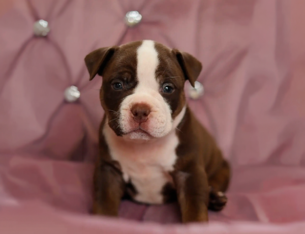 Малышка в ожидаемом типе "покет", крепко сложена, с широкой грудной клеткой, массивной головой, на толстых лапках. Шерсть девочки правильной структуры и великолепный окрас шоколад с белым. У малышки очень миловидная мордочка и выразительный взгляд. Без брака и недостатков.