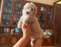 Малышка превосходно сложена, с красивыми породными формами, восхитительной головой и трогательной мордочкой. Её курчавая шубка бесподобного качества, смотрится стильно и нарядно, нежно-бежевого окраса с белыми пятнышками, в одном носочке.