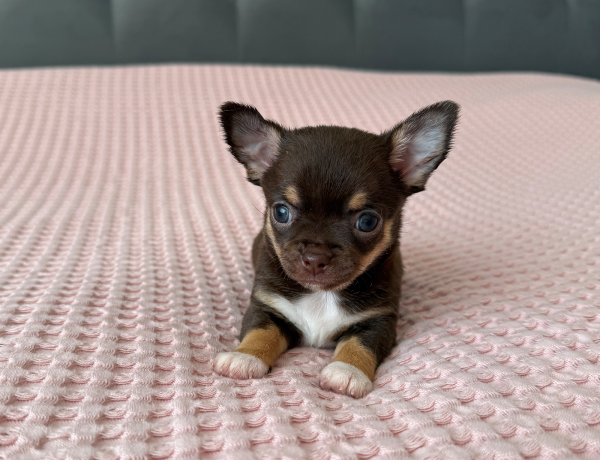 Короткошерстная малышка Чихуахуа с чудесным шоколадно-подпалым окрасом и белой грудкой. Девочка стандартного размера, с очаровательной мордочкой и умными глазками.