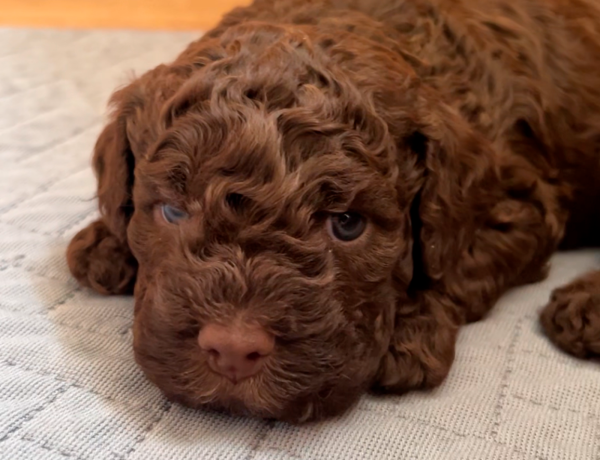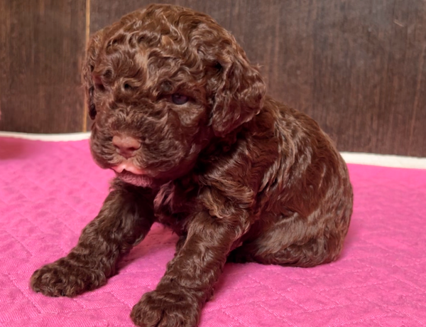 Очень красивая девочка лаготто. Эти густые и волнистые бровки просто великолепны. Такая маленькая, а уже такая структура шерсти, локон будет просто невероятного качества. Очень наполненная мордашка, толстенькие лапки, и этот взгляд в самое сердечко. По моему это самый красивый ребёнок на этой планете, ну это и не удивительно с такой родословной и предками, очень сложно будет с таким расстаться.